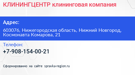 КЛИНИНГЦЕНТР, клининговая компания по адресу 603076, Нижегородская область, Нижний Новгород, Космонавта Комарова, 21 в дальнейшем Организация, размещена в следующих категориях: