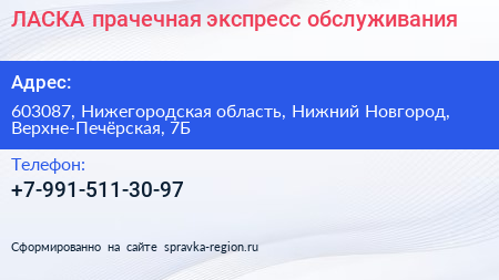 ЛАСКА, прачечная экспресс-обслуживания по адресу 603087, Нижегородская область, Нижний Новгород, Верхне-Печёрская, 7Б в дальнейшем Организация, размещена в следующих категориях: