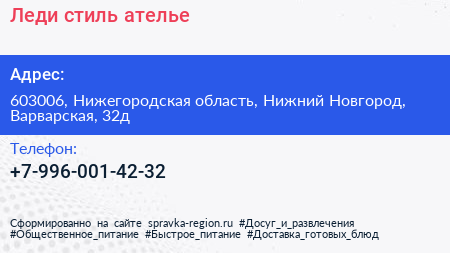 Леди стиль, ателье по адресу 603006, Нижегородская область, Нижний Новгород, Варварская, 32д в дальнейшем Организация, размещена в следующих категориях: