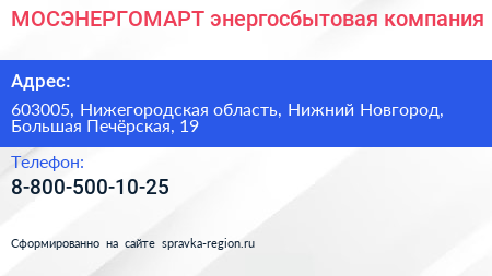 МОСЭНЕРГОМАРТ, энергосбытовая компания по адресу 603005, Нижегородская область, Нижний Новгород, Большая Печёрская, 19 в дальнейшем Организация, размещена в следующих категориях:
