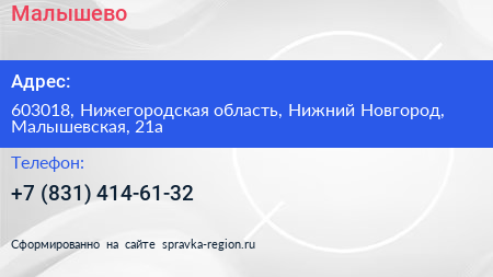 Малышево по адресу 603018, Нижегородская область, Нижний Новгород, Малышевская, 21а в дальнейшем Организация, размещена в следующих категориях: