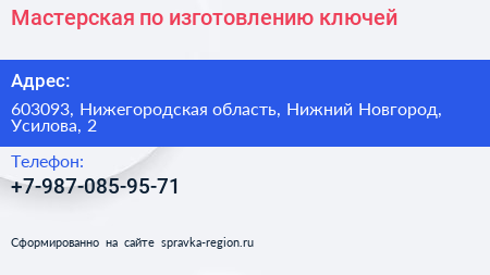 Мастерская по изготовлению ключей по адресу 603093, Нижегородская область, Нижний Новгород, Усилова, 2 в дальнейшем Организация, размещена в следующих категориях: