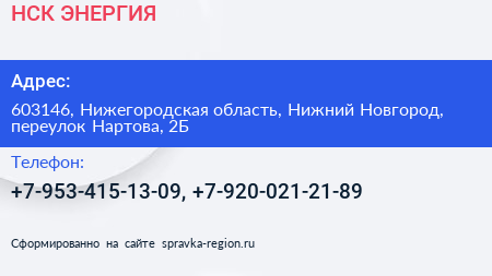 НСК-ЭНЕРГИЯ по адресу 603146, Нижегородская область, Нижний Новгород, переулок Нартова, 2Б в дальнейшем Организация, размещена в следующих категориях: