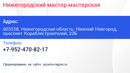 Нижегородский мастер, мастерская по адресу 603158, Нижегородская область, Нижний Новгород, проспект Кораблестроителей, 22Б в дальнейшем Организация, размещена в следующих категориях: