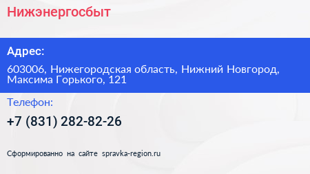 Нижэнергосбыт по адресу 603006, Нижегородская область, Нижний Новгород, Максима Горького, 121 в дальнейшем Организация, размещена в следующих категориях: