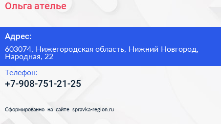 Ольга, ателье по адресу 603074, Нижегородская область, Нижний Новгород, Народная, 22 в дальнейшем Организация, размещена в следующих категориях: