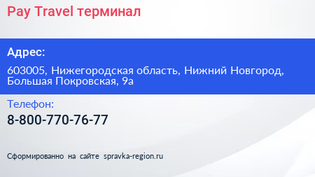 Pay.Travel, терминал по адресу 603005, Нижегородская область, Нижний Новгород, Большая Покровская, 9а в дальнейшем Организация, размещена в следующих категориях:
