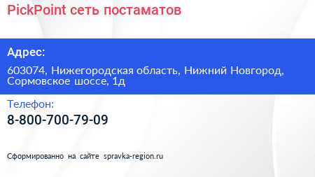 PickPoint, сеть постаматов по адресу 603074, Нижегородская область, Нижний Новгород, Сормовское шоссе, 1д в дальнейшем Организация, размещена в следующих категориях: