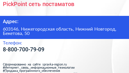 PickPoint, сеть постаматов по адресу 603146, Нижегородская область, Нижний Новгород, Бекетова, 50 в дальнейшем Организация, размещена в следующих категориях: