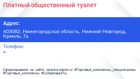 Платный общественный туалет по адресу 603082, Нижегородская область, Нижний Новгород, Кремль, 7а в дальнейшем Организация, размещена в следующих категориях: