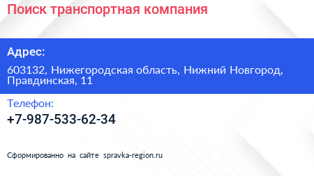 Поиск, транспортная компания по адресу 603132, Нижегородская область, Нижний Новгород, Правдинская, 11 в дальнейшем Организация, размещена в следующих категориях: