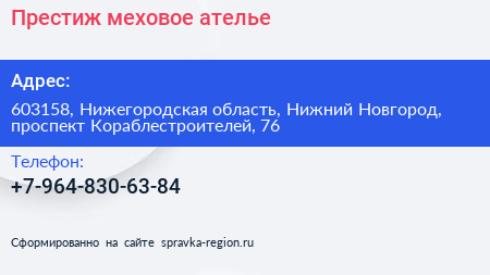Престиж, меховое ателье по адресу 603158, Нижегородская область, Нижний Новгород, проспект Кораблестроителей, 76 в дальнейшем Организация, размещена в следующих категориях: