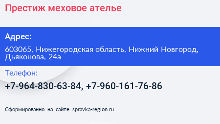 Престиж, меховое ателье по адресу 603065, Нижегородская область, Нижний Новгород, Дьяконова, 24а в дальнейшем Организация, размещена в следующих категориях: