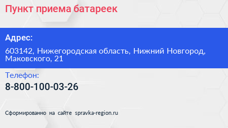 Пункт приема батареек по адресу 603142, Нижегородская область, Нижний Новгород, Маковского, 21 в дальнейшем Организация, размещена в следующих категориях:
