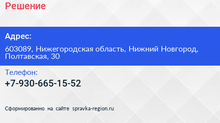 Решение по адресу 603089, Нижегородская область, Нижний Новгород, Полтавская, 30 в дальнейшем Организация, размещена в следующих категориях: