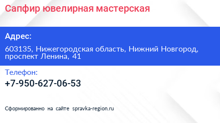 Сапфир, ювелирная мастерская по адресу 603135, Нижегородская область, Нижний Новгород, проспект Ленина, 41 в дальнейшем Организация, размещена в следующих категориях: