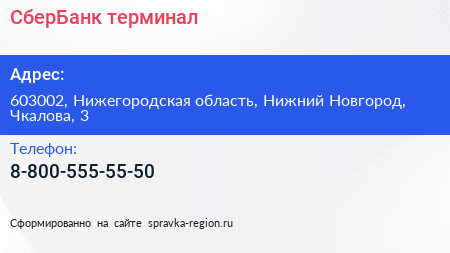СберБанк, терминал по адресу 603002, Нижегородская область, Нижний Новгород, Чкалова, 3 в дальнейшем Организация, размещена в следующих категориях: