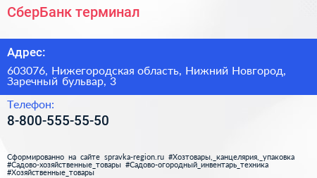 СберБанк, терминал по адресу 603076, Нижегородская область, Нижний Новгород, Заречный бульвар, 3 в дальнейшем Организация, размещена в следующих категориях: