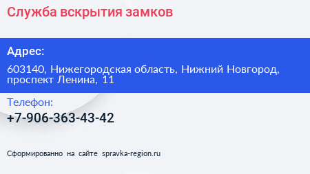 Служба вскрытия замков по адресу 603140, Нижегородская область, Нижний Новгород, проспект Ленина, 11 в дальнейшем Организация, размещена в следующих категориях: