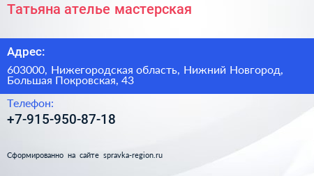 Татьяна, ателье-мастерская по адресу 603000, Нижегородская область, Нижний Новгород, Большая Покровская, 43 в дальнейшем Организация, размещена в следующих категориях: