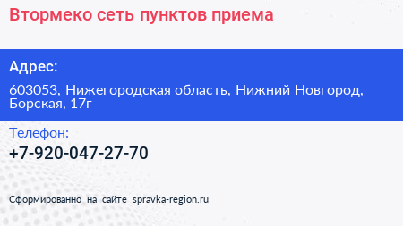 Втормеко, сеть пунктов приема по адресу 603053, Нижегородская область, Нижний Новгород, Борская, 17г в дальнейшем Организация, размещена в следующих категориях: