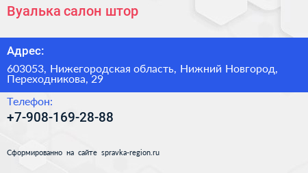 Вуалька, салон штор по адресу 603053, Нижегородская область, Нижний Новгород, Переходникова, 29 в дальнейшем Организация, размещена в следующих категориях: