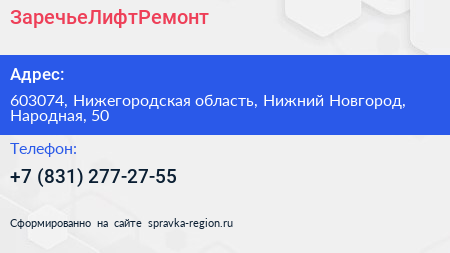 ЗаречьеЛифтРемонт по адресу 603074, Нижегородская область, Нижний Новгород, Народная, 50 в дальнейшем Организация, размещена в следующих категориях: