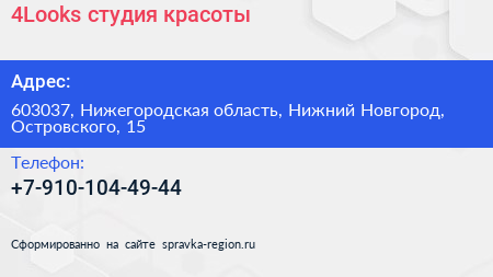 4Looks, студия красоты по адресу 603037, Нижегородская область, Нижний Новгород, Островского, 15 в дальнейшем Организация, размещена в следующих категориях: