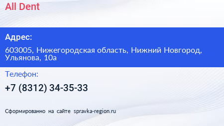 All Dent по адресу 603005, Нижегородская область, Нижний Новгород, Ульянова, 10а в дальнейшем Организация, размещена в следующих категориях: