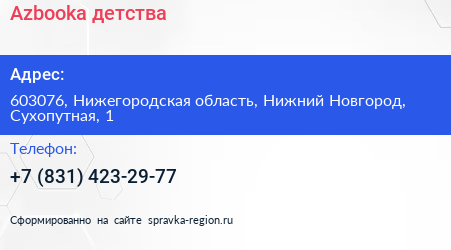 Azbooka детства по адресу 603076, Нижегородская область, Нижний Новгород, Сухопутная, 1 в дальнейшем Организация, размещена в следующих категориях: