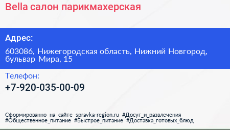 Bella, салон-парикмахерская по адресу 603086, Нижегородская область, Нижний Новгород, бульвар Мира, 15 в дальнейшем Организация, размещена в следующих категориях: