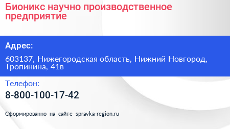 Бионикс, научно-производственное предприятие по адресу 603137, Нижегородская область, Нижний Новгород, Тропинина, 41в в дальнейшем Организация, размещена в следующих категориях: