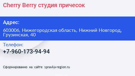 Cherry Berry, студия причесок по адресу 603006, Нижегородская область, Нижний Новгород, Грузинская, 40 в дальнейшем Организация, размещена в следующих категориях: