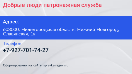 Добрые люди, патронажная служба по адресу 603000, Нижегородская область, Нижний Новгород, Славянская, 1а в дальнейшем Организация, размещена в следующих категориях: