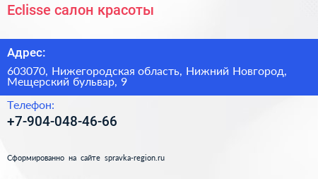 Eclisse, салон красоты по адресу 603070, Нижегородская область, Нижний Новгород, Мещерский бульвар, 9 в дальнейшем Организация, размещена в следующих категориях: