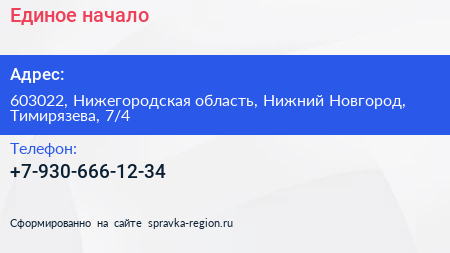 Единое начало по адресу 603022, Нижегородская область, Нижний Новгород, Тимирязева, 7/4 в дальнейшем Организация, размещена в следующих категориях: