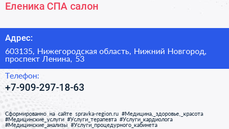 Еленика, СПА-салон по адресу 603135, Нижегородская область, Нижний Новгород, проспект Ленина, 53 в дальнейшем Организация, размещена в следующих категориях: