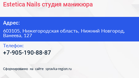 Estetica Nails, студия маникюра по адресу 603105, Нижегородская область, Нижний Новгород, Ванеева, 127 в дальнейшем Организация, размещена в следующих категориях: