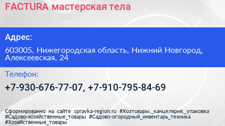FACTURA, мастерская тела по адресу 603005, Нижегородская область, Нижний Новгород, Алексеевская, 24 в дальнейшем Организация, размещена в следующих категориях:
