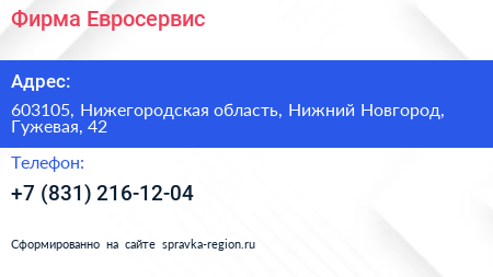 Фирма Евросервис по адресу 603105, Нижегородская область, Нижний Новгород, Гужевая, 42 в дальнейшем Организация, размещена в следующих категориях: