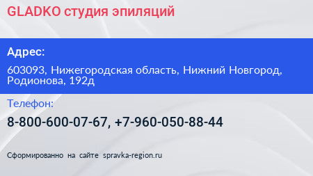 GLADKO, студия эпиляций по адресу 603093, Нижегородская область, Нижний Новгород, Родионова, 192д в дальнейшем Организация, размещена в следующих категориях: