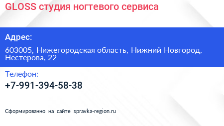GLOSS, студия ногтевого сервиса по адресу 603005, Нижегородская область, Нижний Новгород, Нестерова, 22 в дальнейшем Организация, размещена в следующих категориях: