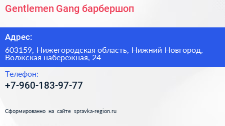 Gentlemen Gang, барбершоп по адресу 603159, Нижегородская область, Нижний Новгород, Волжская набережная, 24 в дальнейшем Организация, размещена в следующих категориях: