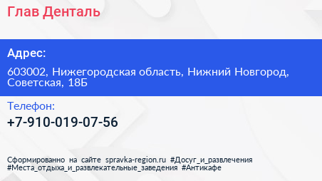 Глав Денталь по адресу 603002, Нижегородская область, Нижний Новгород, Советская, 18Б в дальнейшем Организация, размещена в следующих категориях: