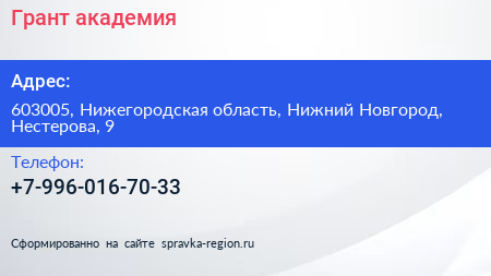 Грант, академия по адресу 603005, Нижегородская область, Нижний Новгород, Нестерова, 9 в дальнейшем Организация, размещена в следующих категориях: