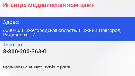 Инвитро, медицинская компания по адресу 603093, Нижегородская область, Нижний Новгород, Родионова, 17 в дальнейшем Организация, размещена в следующих категориях: