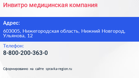 Инвитро, медицинская компания по адресу 603005, Нижегородская область, Нижний Новгород, Ульянова, 12 в дальнейшем Организация, размещена в следующих категориях: