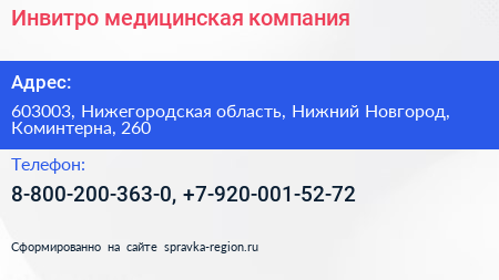Инвитро, медицинская компания по адресу 603003, Нижегородская область, Нижний Новгород, Коминтерна, 260 в дальнейшем Организация, размещена в следующих категориях:
