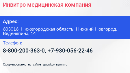 Инвитро, медицинская компания по адресу 603016, Нижегородская область, Нижний Новгород, Веденяпина, 14 в дальнейшем Организация, размещена в следующих категориях: