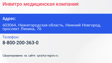 Инвитро, медицинская компания по адресу 603064, Нижегородская область, Нижний Новгород, проспект Ленина, 76 в дальнейшем Организация, размещена в следующих категориях: